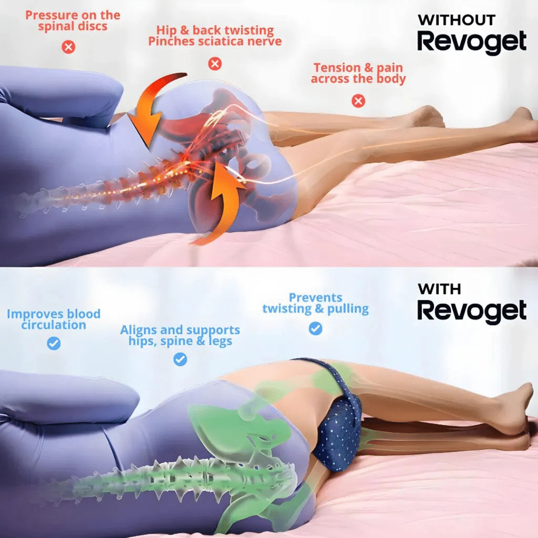 The Revoget Alignment Pillow works by addressing the root cause of discomfort associated with side sleeping: spinal misalignment. When you sleep on your side without adequate support, your upper leg can drop, causing your hips to twist and your knees to press together. This misalignment can lead to nerve compression, joint inflammation, and muscle pain.